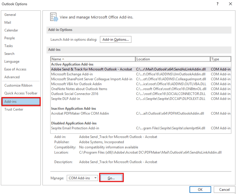 - Once the Outlook is open, go to File > Options > Add-ins and then click on Go