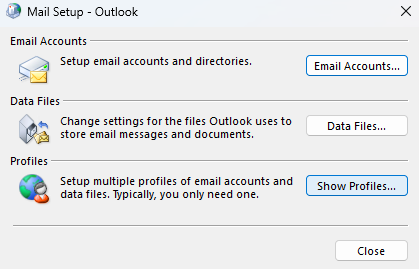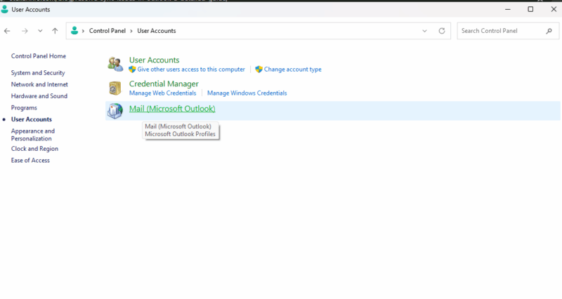- Go to Control Panel > User Accounts > Mail (Microsoft Office).