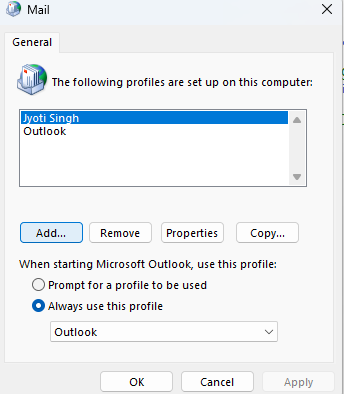 Creating a new Outlook profile can fix sync problems if caused by a corrupted or misconfigured profile. Follow the steps given below to create a new Outlook profile: