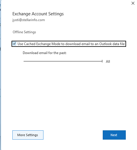 - Make sure that the Use Cached Exchange Mode checkbox is checked. Click on More Settings.